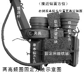在调整好主收亚太2R卫星节目的基础上,手持双本振Ku高频头在单本振Ku高频头右上方5厘米左右距离晃动,要同时接好电视看信号质量,找到最佳接收位置。新唐人对亚洲信号已经加强,调试时高频头左右晃动5公分都有信号,只是信号强弱不同。经调试得知,最佳的一锅双星偏收W5新唐人的双本振Ku高频头的接收位置为:在主收亚太2R卫星单本振Ku高频头的右上方较靠上的方位,不向以前有同修所说的紧挨着,要相距5公分左右,两高频头平行,但接收新唐人的高频头距离要较主收亚太2R卫星的高频头靠近锅面1—2厘米(见下图)。由于两高频头之间有约5厘米的距离,我是在中间垫了一块软泡沫塑料,用细铁丝绑住固定的。