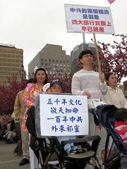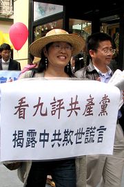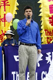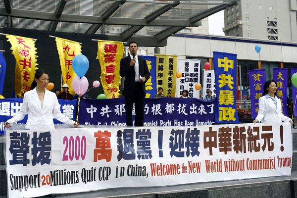 法轮功学员杨先生谈到自己的体会:“我是从台湾来的。一九四九年我的父母从中国大陆到了台湾。从两岸对比来看,台湾有信仰自由,而在中国大陆发生了中共对法轮功的迫害、对其他人士信仰的迫害,我们觉的应该要站出来(反迫害)。今天我们参加这个由大纪元等举办的退党集会,有特别的意义。在中国大陆,中共恶党统治了五十多年,民众的信仰自由是被剥夺了,法轮功学员无辜遭受迫害、而且是很残酷的。就在二零零四年十一月大纪元时报发表了《九评共产党》之后,中国人在觉醒,认清中共邪恶本质之后,中国才会发生真正的改变。今天这个集会,就是为了声援在中国大陆的人士退出中共,今天即将达到二千万,退党的人数还会有增加。”