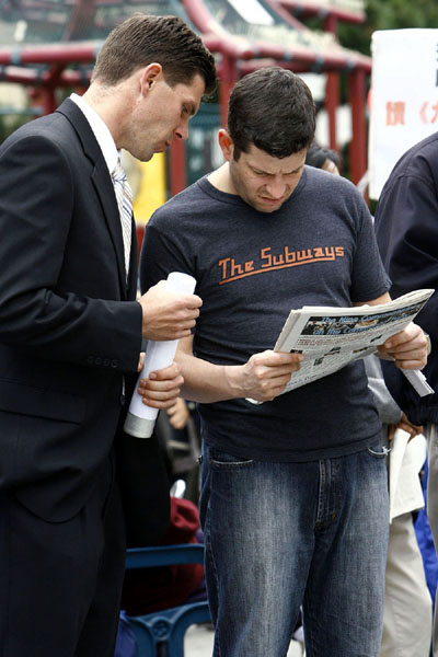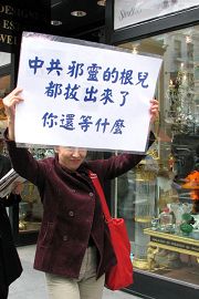 很多过路的人主动伸手要传单。一位男士在仔细地读了传单后又细细的打量着每一个横幅。他站在中文的横幅前问横幅写的是什么,一位华人女士给他翻译了上面的内容并告诉他对面就是中国领事馆后,他恍然大悟地说:“噢,这个内容传单里都写着呢。这可是个好事,大好事。”还有一些对中共独裁政权罪行比较了解的民众主动走上前来表示:“祝你们好运!”