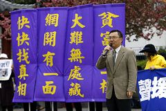 当天发言者踊跃,有刚从中国大陆来美不久的吴女士,关心中华民族前程、来自现居旧金山的印尼华侨关先生,及希望之声国际广播电台的著名评论员兰述。吴女士讲述了在中国因为散发法轮功真相资料而遭非法关押,及酷刑折磨的亲身经历。关先生则表示希望中国人能找回传统的文化,并有个美好的未来。