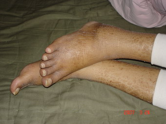 【明慧网二零零七年三月二十六日】石家庄法轮功学员栾福生在山西省晋中监狱(山西省第一监狱,也称祁县监狱)被迫害的全身浮肿,身体部份皮肤呈黑紫色,腹部肿胀,极度虚弱(见照片),这是中共邪党对大法、大法弟子及世人犯下的又一桩不可饶恕之罪恶。