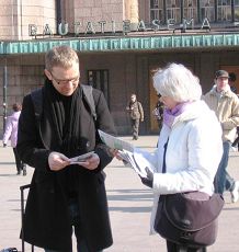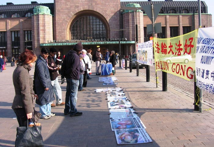 ![]() 赫尔辛基火车站旁的洪法讲真相活动引来民众驻足观看 |