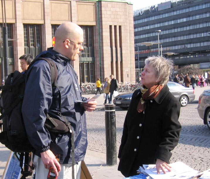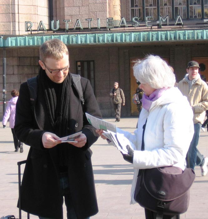 一位女士和学员斯尼卡(Sinikka)谈了很久,从九评退党到法轮功反迫害,她都很支持,并特别表示了她对学炼法轮功的浓厚兴趣。
