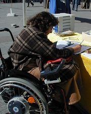 坐在轮椅上的德国妇女很吃力的签下她的名字,她认为这种行为是犯罪(指中共活摘法轮功学员器官),必须制止。她是通过女友得知这一消息的,女友告诉她,最近有一个惊人的丑闻,指的就是这件事。