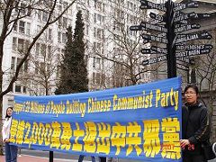 二零零七年三月二十四日,在美国俄勒冈州波特兰市的市中心广场,写着“声援两千万勇士退出中共邪党”的巨大横幅吸引了路人的目光。