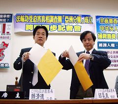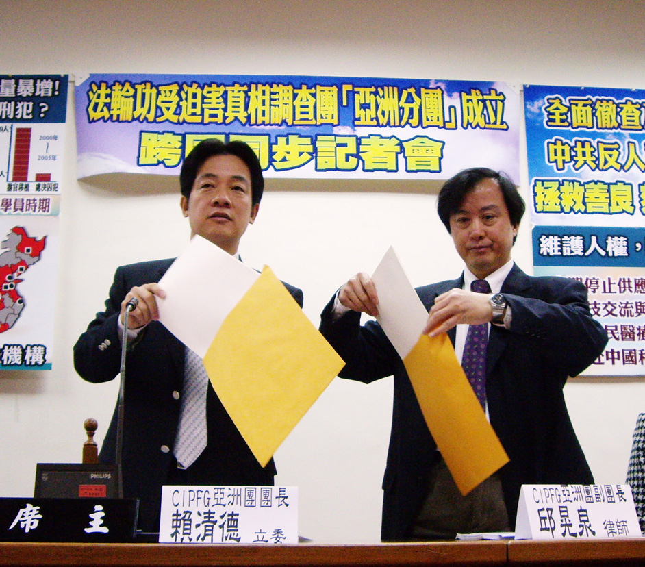 法轮功受迫害真相联合调查团(CIPFG)「亚洲分团」团长、立法委员赖清德与副团长邱晃泉律师。