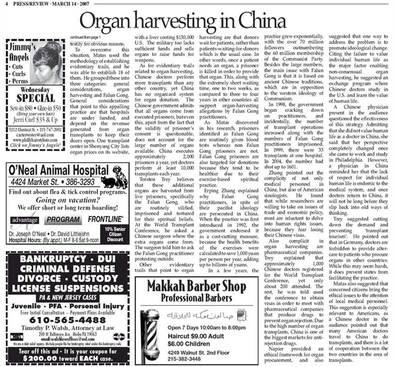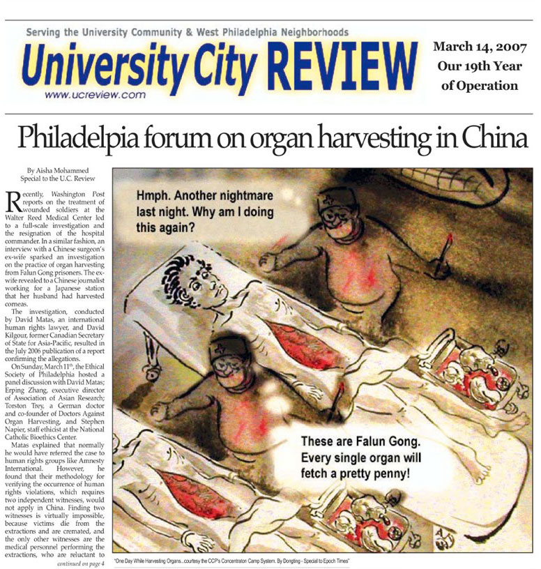 费城伦理学会于三月十一日星期天主办了专题小组研讨会,小组成员包括:大卫·麦塔斯、亚洲研究会执行主任张而平、德国医生兼医生反对活摘器官联合会发起人之一托司顿·萃(Torsten Trey)、美国天主教生物伦理中心主要成员史帝汶·纳匹尔(Stephen Napier)。