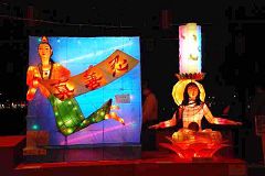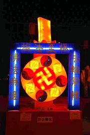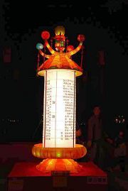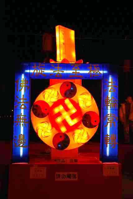 法轮功学员展出的花灯有:“法轮”、“论语”、“飞天”“天人合一”等四件作品,自去年七月起即开始筹划制作,参与人员从参加讲习、购置材料、编制骨架、缝裁灯身等,一路摸索学习,可说是甘苦备尝。一位参与制作的学员说:“大家都没有经验,经由集思广益,决定制作主题后,请教专家,搬运材料,没达到标准的作品就从新制作,每一件都是历经好几次才完成的,你看那个法轮灯,他能够正转九圈、反转九圈,那可是经过大家共同思考、精心设计出来的。”