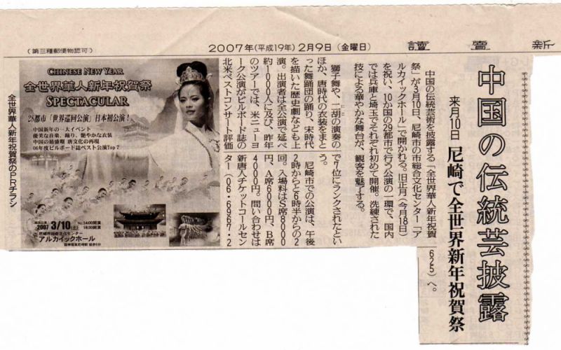 【明慧网二零零七年三月八日】神韵艺术团的国际巡回演出,将于三月十日在日本关西尼崎市举办第一站的两场演出,然后演出团将抵达首都东京,于三月十四日在大宫声乐城进行日本第二站的演出,将纯正的盛唐文化带给久违了的日本观众。