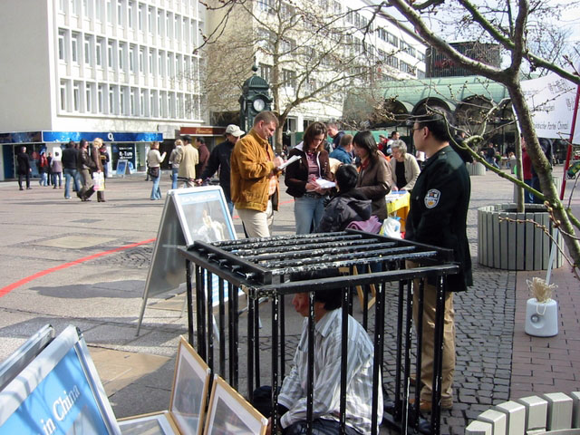 一位上了年纪的女士流着眼泪来到展位前,她表示法轮功学员真人模拟的迫害情景(一位法轮功学员被捆绑着关在笼子里,旁边站着一个穿制服的看守)和展位后面悬挂的关于器官掠夺的真相横幅使她不忍再看下去。她说这太惨无人道了,并且唤起了她对孩提时曾经历过的第二次世界大战的回忆。