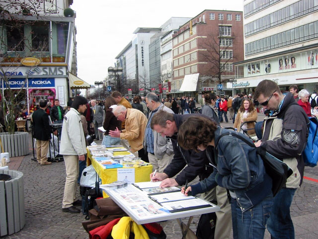 此时的汉诺威沉浸在一片繁忙热闹之中。路人中已能看到不少来参观博览会的游客,特别是有一些来自中国大陆。这些中国游客成为法轮功学员重点讲真相的对象,因为他们当中很多人听信了中共国家宣传机器对法轮功的造谣诽谤。能走出国门来到这里,这是他们难得的获悉法轮功无辜遭迫害真相,以及了解目前在退党大潮推动下已有两千多万人退出中共组织的机会。这场退党大潮是由详尽评述了中共的邪恶本质以及它在统治期间对中国人民所犯的残暴罪行的《九评共产党》一书的发表而引发的。