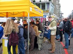 路人络绎不绝的来到法轮功的信息日展位,他们想要更深入的了解迫害的情况,尤其是中共活摘法轮功学员器官的详情,然后在抗议书上签名以表达他们对迫害暴行的抗议。