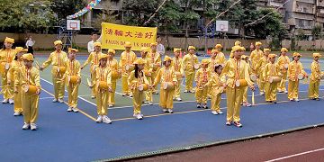 三月的另一场表演是台北县三重市三光国小的校庆演出,而三重明慧学校的假日上课地点就是在三光国小,每天早上也有许多法轮功学员在三光国小炼功,因此缘故,对明慧腰鼓队知之甚详的三光国小校长,便邀请大家于当天八点到校共襄盛举、义务演出。但是由于每回演出前小弟子都必须先化妆、列队、预演,因此需要提早一小时集合,这种情况下有法轮功学员是天一亮远从淡水、树林改换了好几趟车才来到三重表演。加上当天太阳很大,而清早出门时气温仍低,所以七点换装时很多小弟子是直接把腰鼓服穿在原本衣服的外面,也就是穿两层衣裤就开始排演;所以在后来等待表演的过程中,不时有人对节节上升的气温喊热,可是每个小弟子都能坚持打完,……等到表演一结束,每个孩子头巾拿下来都是湿的!