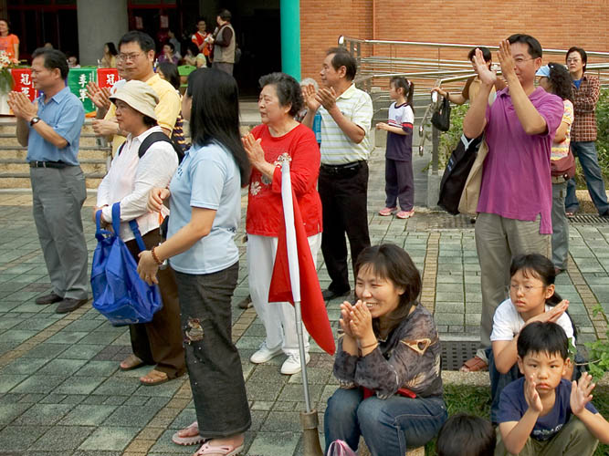 除此之外,三月十二日星期一,一样有将近三十人的小弟子,风尘仆仆的在放学后由各家长(有的家长在工作上安排请一、两个小时事假,有的排除万难抽身参加)各自将原本放学后会在安亲班、补习班或家中写功课的小弟子,接送到「北市老人健春协会」晚会的现场,为三百多名的银发来宾表演腰鼓。这样努力的付出,只为把真善忍的种子带到人们的心中,让有缘亲见的来宾都知道:法轮大法好!