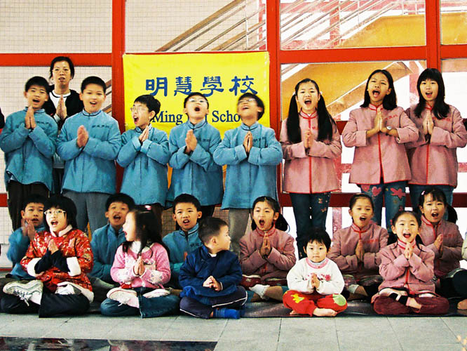 每个星期六早上,三重明慧学校都会向三光国小借用场地,用来学法炼功及练习腰鼓。警卫伯伯每个星期看到小朋友认真的学打鼓,有时过了中午用餐时间,大家依然很努力的练习,无论刮风下雨,小朋友们都会坚持来上课。而上课时孩子总是表现的非常的好,既不吵闹也不喧哗,更不乱丢垃圾。有时天冷的很,孩子依然认真学法,也不喊累!(因为三重明慧是在走廊上课,就在警卫室旁边。)所以长期相处下来,感受最深的警卫伯伯总夸明慧学校的小朋友乖巧,跟一般的小朋友差异很大!所以连警卫先生也极力推荐小朋友在校庆演出。