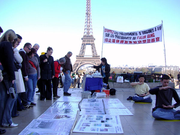 巴黎法轮功学员除了向人们传递法轮功美好和慈悲的信息外,同时也让法国民众、来自世界各地的游客、还有中国大陆的游客们知道,八年来,中共持续对法轮功学员的残酷迫害。一幅幅触目惊心的图片展示着惨烈的故事,特别是民众们被真相展板上揭露的中共活体摘取法轮功学员器官的罪行所震惊。从他们的表情中可以知道,这个星球上最残忍、残酷的罪恶令人们发自内心的愤慨。了解真相的人们有的签名支持法轮功抗议中共的迫害,有的前来了解更多的真相,有的中国人也在不停的拍摄这些真相。