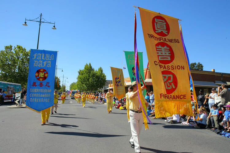 星期一的游行是最盛大的,墨尔本法轮功学员连续六年参加游行,曾经赢得最高奖项,使越来越多的人了解了法轮大法,喜爱法轮大法。今年参加游行的是七十多人的队伍,开头是三个小姑娘手捧着“真、善、忍”三个大字,紧接着是威武的腰鼓阵响彻天宇,随后是优雅的唐装舞、翩跹的彩绸舞和欢快的扇子舞,还有功法表演及莲花彩车,伴随着“法轮大法好”的音乐,整个队伍展现着慈悲与祥和。