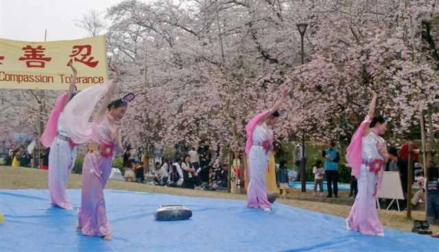 在美丽的樱花映衬下,身着传统服装的法轮功学员们,表演了柔美的舞蹈《花仙》和缓、慢、圆的功法,吸引了很多游人驻足观看。有的游人当场学功。