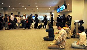 二零零七年四月十一日晚,新加坡法轮功学员在日本东京成田机场,以炼功的方式给回国的中国人展现法轮功真相。