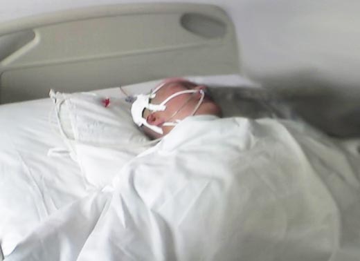 但,遮掩不了的是:张连英剃光了头发的头上插着粗细不同的管子,有的管里满是从脑内引出的血,大块的医用药布包扎在头部手术后的刀口上,鼻内也插着管子,见上图。