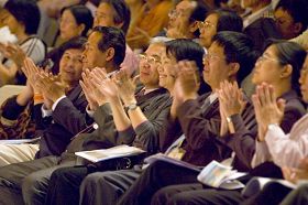 尤其是全体演员出场接受观众献花谢幕时,坐在第一排的屏东县长曹启鸿率先站起来热烈鼓掌,并激动的说:「幸好我来了!」在曹县长身旁的行政院南部联合服务中心执行长尤宏等政商、艺文界名流和观众也纷纷起立热烈的鼓掌、叫好。神韵艺术团公演,在各地已经形成一股前所未有的热潮。