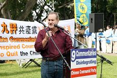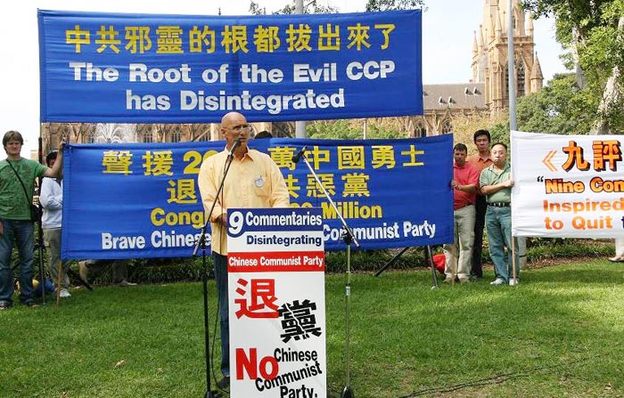 台湾退党服务中心代表侯念祖致词时表示,天灭中共是历史的必然,两年多以来,三退人数如同滚雪球般的迅速扩大,从每日数千人到现在的每日三、四万人,从使用化名到今日公开用真名退党,从一般党、团员到现在的政界、军队高层干部,甚至是驻加拿大中国领事馆的官员家属以公开退党表示对暴政的唾弃,这乃是天意。