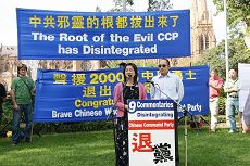 住在游行集合附近的八十多岁,祖籍广东的马阿姨,听到咚咚的鼓声,跑来一探究竟。当她看到「退出共产党」的展板时,不禁回忆起中国共产党对她家族的种种迫害。