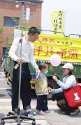 苏先生来自台北,和太太及儿子推着五个月大的娃儿也来参加声援活动。以前没有修炼常常发脾气,炼法轮功多年,他认为最大的改变就是心性变好。他表示由衷感谢法轮功赐予他新生的喜悦。迫害法轮功的中共罪恶深重,看到大陆那么多人唾弃这个恶党,苏先生全家当然要来声援退党。