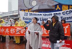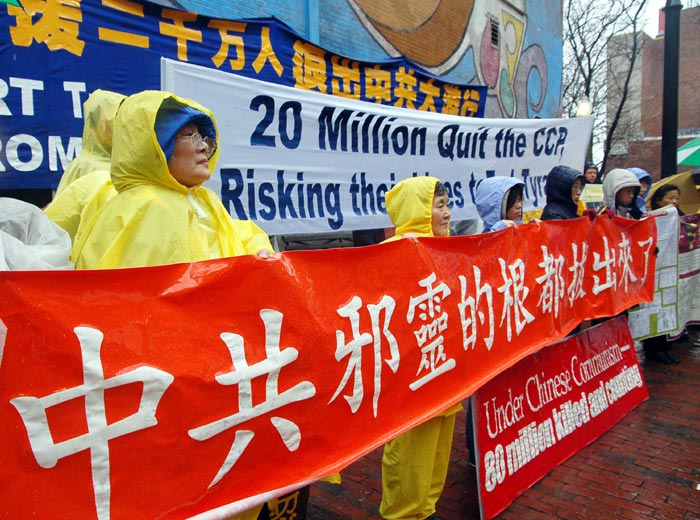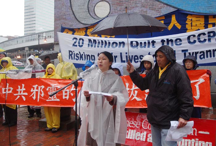 【明慧网二零零七年四月十七日】自大纪元推出系列社论《九评共产党》以来,波士顿人见证了百万人退党、五百万人退党、千万人退党、一千五百万人退党,到如今的二千万滚滚退党大潮,人们意识到中共的暴政要灭亡了。波士顿退党服务中心顺应天意,继四月十四日集会后,以「中共邪灵的根都拔出来了」为主题,于四月十五日在波士顿中国城再次集会,声援二千万勇士退出中共“党团队”。