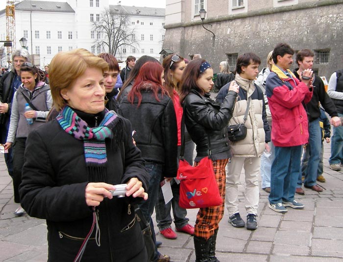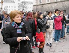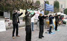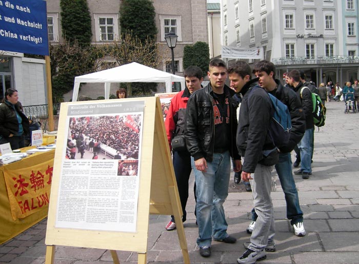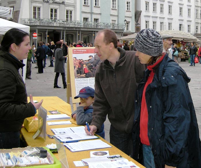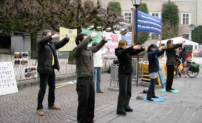 初春的萨尔斯堡格外美丽,吸引了来自世界各地的观光客。学员们祥和的功法演示加上美丽的小城,和揭露中共暴行的图片展形成了鲜明的对比。很多游人和当地民众都在征签表上签名,表示对法轮功学员的支持。