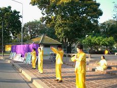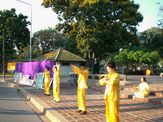 美展从每天下午四点开始,展出的几十幅画由修炼法轮功的艺术家创作,不少是刻画法轮功学员无辜遭受中共残酷迫害,但仍然对信仰坚贞不移的作品,表现的内涵令人震撼,感人泪下。法轮功学员向前来观赏的游人解说每一幅作品,通过画展帮助人们进一步了解法轮功,让更多的泰国人知道为什么如此祥和的法轮功会遭受中共无理的打压,知道了在中国正发生着一场迫害。