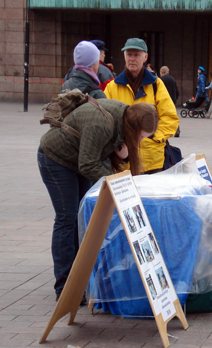 四月的赫尔辛基,冬日的寒气似乎还未完全消退,阴沉的天空不时洒下阵阵牛毛细雨,还夹杂着透骨的寒风。尽管如此,仍有不少过往的行人驻足观看横幅、展板上一幅幅惨不忍睹的图片——中共为逼迫法轮功学员放弃信仰,使用了上百种酷刑。人们被发生在中国的这场迫害的血腥程度所震惊,表现出非常难过的神情。
