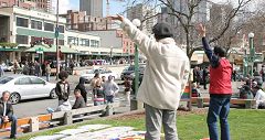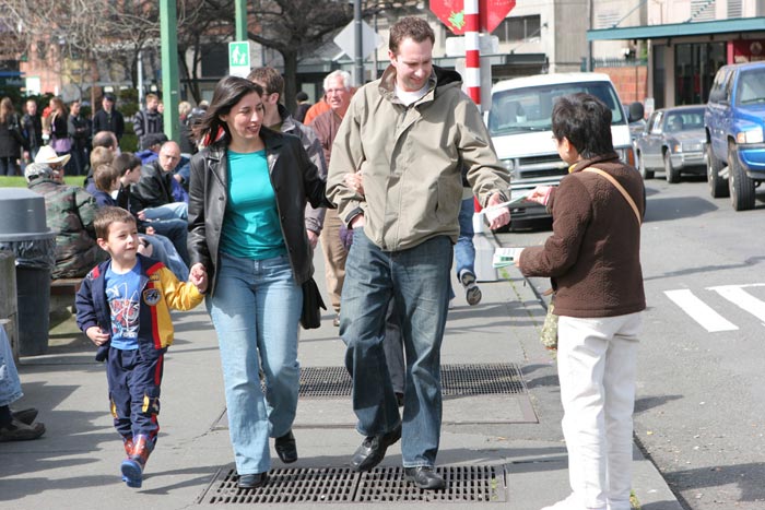 不少人看了图片资料,听了学员讲解后,想帮助受中共迫害的法轮功学员。有一位大学生请求学员多给他一些资料,他要带到学校去发。还有一位墨西哥人,他看了揭露中共活摘法轮功学员器官的资料后,义愤填膺,主动的拿了一叠资料站在街头发。第二个星期他又来了,一边发资料一边讲中共的罪行。他说:要让更多的人知道这件事,更多的人来参与制止迫害。