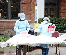 在两个研讨会场外,都有法轮功学员做活摘器官的模拟展示。直观的演示,让很多过路的人了解到了真相。
