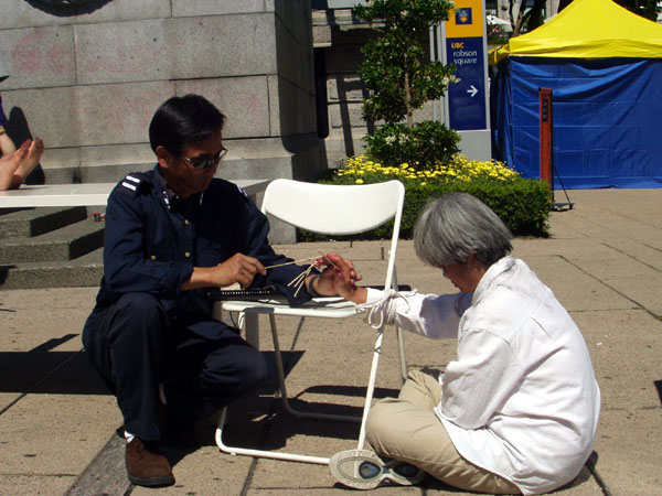 无论是炎炎夏日,还是白雪飘飘,中领馆前二十四小时和平抗议,总有张秀莲。张秀莲特别记得,“二零零一年的冬天,那天雪很大,身体周围的雪慢慢化成雪水,人就泡在雪水里。从早上坐到傍晚,冰水浸透全身,我在冰水中整整泡了十几个小时。”