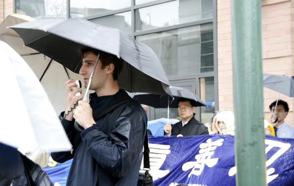 纽约中领馆门前,阴雨绵绵,冷风袭人。