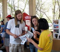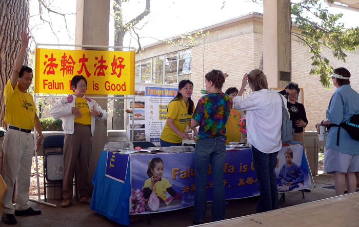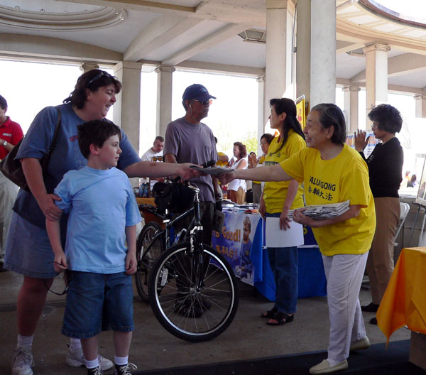 活动刚开始,就有人来到法轮功学员的展位前了解更多信息。同往年一样,法轮功学员的展位吸引了很多人,想了解更多情况的、要学功的,签名反对中共迫害法轮功的,人们纷纷在展位前驻足,与学员交谈。很多人以前都听说过法轮功,或多次见过法轮功学员炼功,还有很多人对东方文化感兴趣,所以非常想学功。