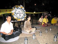 一如当年上访时的情景,法轮功学员们和平的静坐及炼功。一盏盏烛光,一条条横幅,吸引了来来往往的行人和驾驶者。
