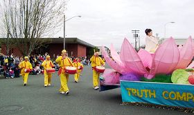 ![]() 法轮功学员多彩的游行队伍深受人们欢迎 |
