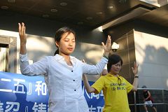 法轮功学员彭女士说:“八年前四•二五法轮功学员和平理性上访,获得国际舆论的赞扬,今天我们来中领馆前纪念四•二五八周年,也悼念被中共迫害致死的、被活体摘取器官的大陆同修。呼吁国际社会关注,共同制止这场迫害。”
