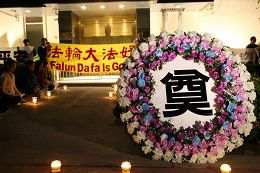 二零零七年四月二十五日晚,美国洛杉矶法轮功学员和部份支持法轮功的民众在中领馆前举行集会和烛光纪念,回顾法轮功八年来走过的和平抗争之路,谴责中共灭绝人性的迫害,悼念成千上万在迫害中失去生命的法轮功学员。