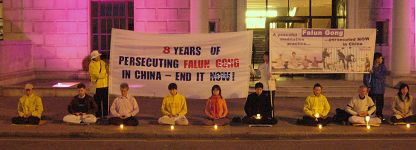 【明慧网二零零七年四月二十七日】二零零七年四月二十五日是发生在北京的“四·二五”法轮功学员万人集体和平上访历史事件的八周年纪念日。英国法轮功学员在伦敦中使馆前和平抗议,以烛光守夜的方式追思被中共迫害致死的中国大陆同修,揭露中共的邪恶和暴行。伴着点亮的烛光,学员们打着呼吁制止迫害的横幅,并持续的集体发正念和炼功。过路的民众被点点烛光中的活动所吸引,纷纷接过学员递给他们的真相传单,有的在汽车中双手合十表示支持,有的在街对面举起相机,记下这特殊的历史时刻。