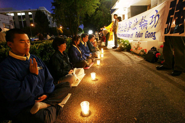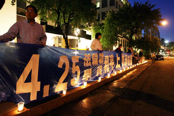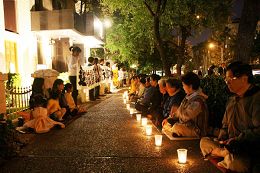 会场中央摆放着一个中间写着“奠”字的大花圈,四周是点燃的蜡烛。大横幅上写着“四二五法轮功学员和平上访没有错”、“法轮大法好”、“停止迫害法轮功”、“退邪党抹兽记 顺天意保平安”“强烈抗议中共迫害高智晟律师”、“中共劳教集中营活体摘取法轮功学员器官盗卖、焚尸灭迹,惨绝人寰 必遭天惩”等标语。
