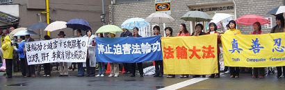 虽然当日上午一直阴雨不断,学员们仍整齐的一字排开,手举“严惩迫害法轮功凶手江泽民、罗干、刘京、周永康”、“停止迫害法轮功”等中日文横幅,谴责中共邪党对法轮功持续至今的残酷迫害。集会者中有当年参加过“四•二五”大上访的老学员;有这次活动之前才刚刚知道“四•二五”意味着什么的新学员;有身孕八个月的主妇;也有八十多岁的老人。八年的反迫害历程中法轮功群体的和平理性、坚定正信的风貌已得到国际社会的公认。
