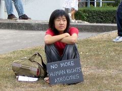 集会上,一位陈姓女大学生带着她自制的、写着“结束人权暴行”的看板,静静的聆听演讲。在接受采访时她表示:“中共在人权方面实施了很多暴行,必须要改变,在这个政权下,人们吃尽了苦。”她建议大家可以向政府机关写信反映。