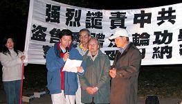 集会在庄严肃穆的气氛中展开。法轮功学员Lee在宣读一份声明时指出,一九九九年四月二十五日,超过一万名法轮功学员以和平理性的方式向中央信访办请愿,希望当局停止全国各地对法轮功修炼者们的无理骚扰、打压、与逮捕。虽然活动以高度理性的方式结束,同时修炼者也展现了中国社会中难能可贵的道德勇气,但中共恶党却为了巩固独裁权力,于三个月后发动了对法轮功学员的全面镇压,造成中国近代史上最大的人权灾难。