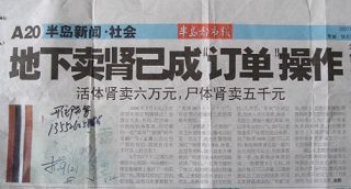 在2007年3月15日的《半岛都市报》A20版报道了这样一条消息“地下卖肾已成‘订单’操作”。其实中共在全国建造了大约三十多个地下秘密集中营用来活体摘取法轮功学员的器官,规模之大,的确已成为“订单”操作。这早已成为中共恶党一庞大的赢利工程。