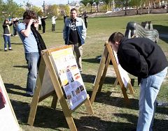 也有一些受中国恶党欺骗中毒很深的人不敢接资料。一个中国人指着他前边的一位男士,对学员说,你知道他是谁吗?他可是我们的书记啊。法轮功学员赶快追上去对那位男士说,您真应该好好看看《九评》,我想您知道胡耀邦吧,他可是当时中共的总书记呀,刘少奇您还记得吧,他可是国家主席啊!他们的下场如何呢?那个人梗着脖子说,不看!学员对着他善意的说道:“‘贫富都一样,大难无处藏,网开有一面,快快找真相’(《找真相》),真相就在这里啊!您从这里匆匆而过,机缘千万不要错过啊!”只见他低下了头,一声不吭的默默离开。