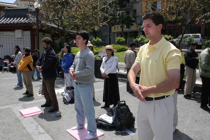 旧金山中国城花园角广场是法轮功学员经常来炼功、讲真相的地方。当天,一些学员在炼法轮功功法,其他的学员向游客讲述法轮功的真相。有的人看到学员炼功的姿势跟着比划着学,有的游客表示要在媒体上将迫害讲出来。