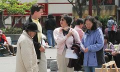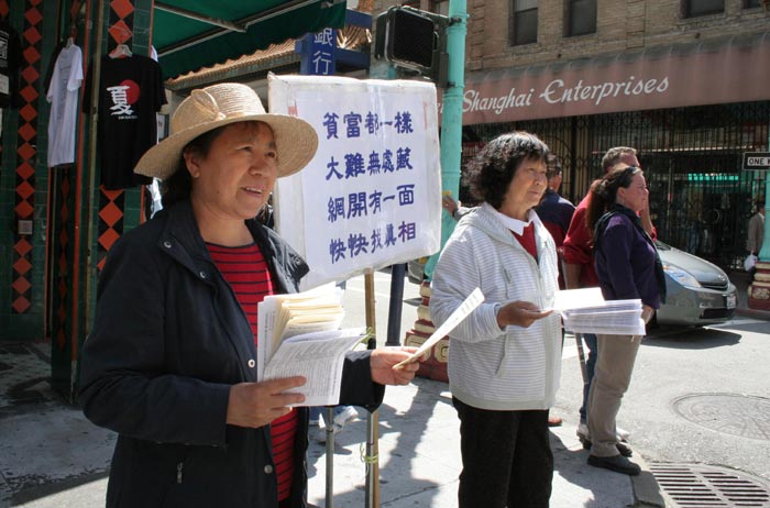 ![]() 法轮功学员在中国城主要街道派发资料 |